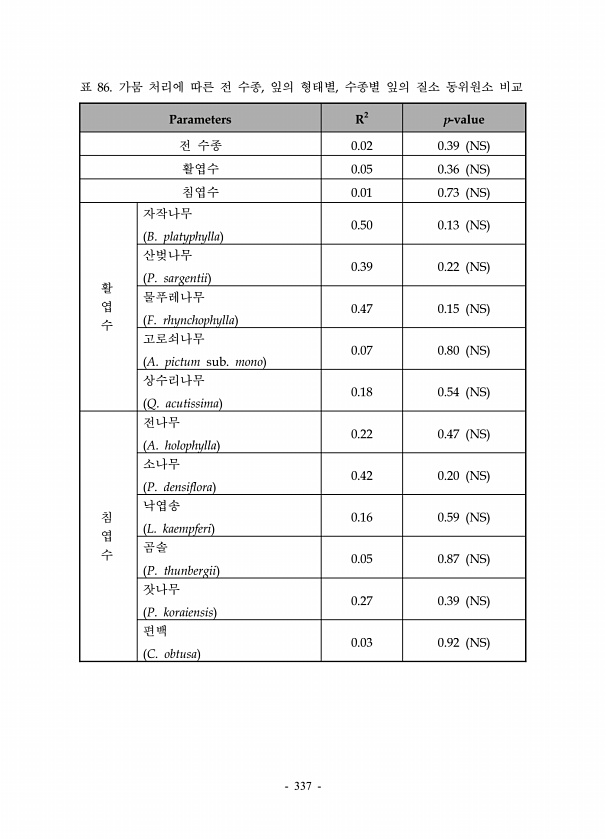 337 Parameters R2 p-value 전 수종 0.02 0.39 NS 활엽수 0.05 0.36 NS 침엽수 0.01 0.73 NS 활 엽 수 자작나무 B. platyphylla 0.50 0.13 NS 산벚나무 P. sargentii 0.39 0.22 NS 물푸레나무 F. rhynchophylla 0.47 0.15 NS 고로쇠나무 A. pictum sub. mono 0.07 0.80 NS 상수리나무 Q. acutissima 0.18 0.54 NS 침 엽 수 전나무 A. holophylla 0.22 0.47 NS 소나무 P. densiflora 0.42 0.20 NS 낙엽송 L. kaempferi 0.16 0.59 NS 곰솔 P. thunbergii 0.05 0.87 NS 잣나무 P. koraiensi...