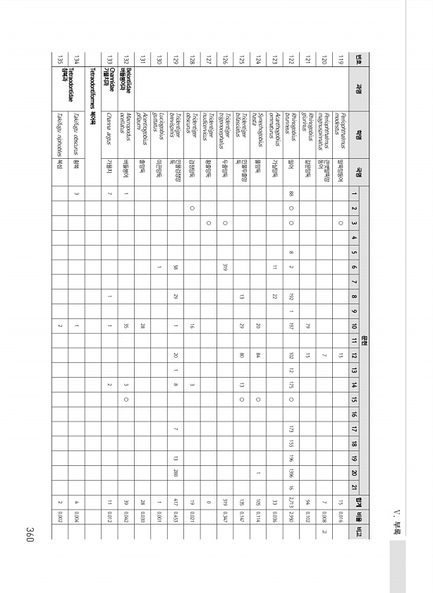 Ⅴ. 부록 360 번호 과명 학명 국명 문헌 합계 비율 비고 1 2 3 4 5 6 7 8 9 10 11 12 13 14 15 16 17 18 19 20 21 119 Periophthalmus modestus 말뚝망둥어 ○ 15 15 0.016 120 Periophthalmus magnuspinnatus 큰볏말뚝망 둥어 7 7 0.008 고 121 Rhinogobius giurinus 갈문망둑 79 15 94 0.102 122 Rhinogobius brunneus 밀어 88 ○ ○ 8 2 192 1 197 102 12 175 ○ 173 155 196 1396 16 2,713 2.950 123 Acanthogobius ommaturus 가실망둑 11 22 33 0.036 124 Synechogobius hast...