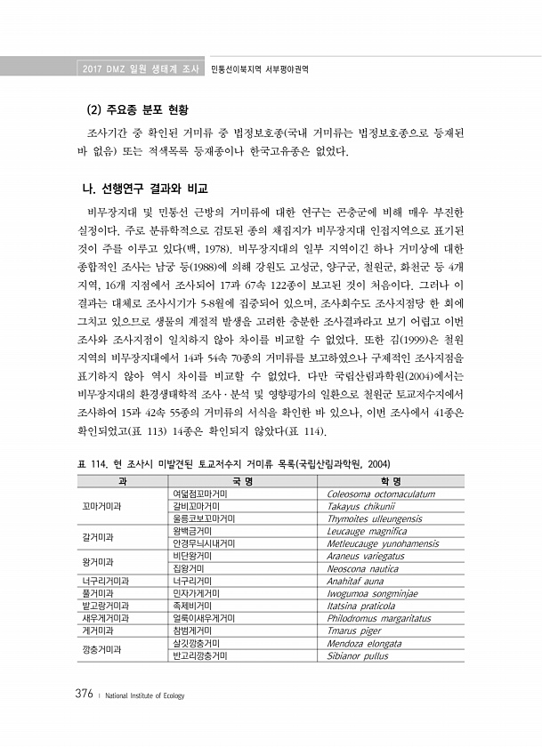 2017 DMZ 일원 생태계 조사 민통선이북지역 서부평야권역 376 ? National Institute of Ecology 2 주요종 분포 현황 조사기간 중 확인된 거미류 중 법정보호종 국내 거미류는 법정보호종으로 등재된 바 없음 또는 적색목록 등재종이나 한국고유종은 없었다. 나. 선행연구 결과와 비교 비무장지대 및 민통선 근방의 거미류에 대한 연구는 곤충군에 비해 매우 부진한 실정이다. 주로 분류학적으로 검토된 종의 채집지가 비무장지대 인접지역으로 표기된 것이 주를 이루고 있다 백, 1978 비무장지대의 일부 지역이긴 하나 거미상에 대한 종합적인 조사는 남궁 등 1988 에 의해 강원도 고성군, 양구군, 철원군, 화천군 등 4개 지역, 16개 지점에서 조사되어 17과 67속 122종이 보고된 것이 처음이...