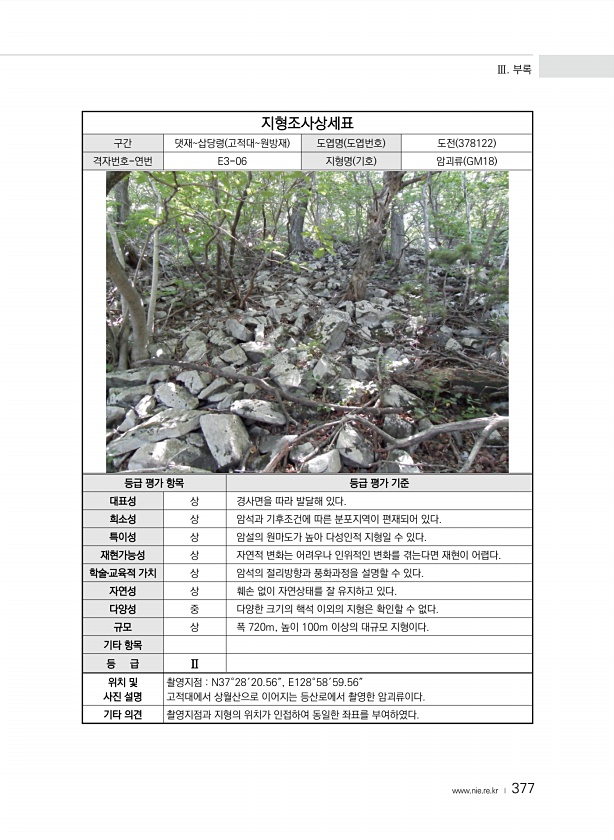 Ⅲ. 부록 www.nie.re.kr ? 377 지형조사상세표 구간 댓재삽당령 고적대원방재 도엽명 도엽번호 도전 378122 격자번호-연번 E3-06 지형명 기호 암괴류 GM18 등급 평가 항목 등급 평가 기준 대표성 상 경사면을 따라 발달해 있다. 희소성 상 암석과 기후조건에 따른 분포지역이 편재되어 있다. 특이성 상 암설의 원마도가 높아 다성인적 지형일 수 있다. 재현가능성 상 자연적 변화는 어려우나 인위적인 변화를 겪는다면 재현이 어렵다. 학술?교육적 가치 상 암석의 절리방향과 풍화과정을 설명할 수 있다. 자연성 상 훼손 없이 자연상태를 잘 유지하고 있다. 다양성 중 다양한 크기의 핵석 이외의 지형은 확인할 수 없다. 규모 상 폭 720m, 높이 100m 이상의 대규모 지형이다. 기타 항목 등 급 Ⅱ 위...