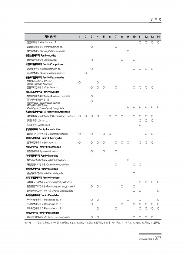 V. 부 록 www.nie.re.kr ?377 국명 학명 1 2 3 4 5 6 7 8 9 10 11 12 13 14 참옆새우류 4 Ampithoe sp. 4 ○ ○ ○ ○ 곧은손참옆새우류 Peramphithoe sp. ○ ○ 털보참옆새우 Sunamphithoe plumosa ○ 큰앞손옆새우과 Family Aoridae 털큰앞손옆새우류 Aoroides sp. ○ ○ ○ 육질꼬리옆새우과 Family Corophiidae 단뱀옆새우류 Monocorophium sp. ○ ○ ○ ○ ○ 중국뱀옆새우 Sinocorophium sinensis ○ 붙은꼬리옆새우과 Family Dexaminidae 보통옆가시붙은꼬리옆새우 Paradexamine fraudatrix ○ ○ 붙은꼬리옆새우류 Polycheria sp. ○ ○ ○...