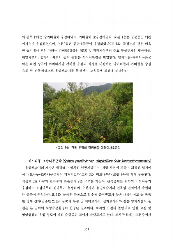361 의 관목층에는 당키버들이 우점하였고 키버들이 준우점하였다 초본 층은 구분종인 애괭 , 1 이사초가 우점하였으며 초본 층은 둥근매듭풀이 우점하였다 표 묵정논과 같은 비옥 , 2 14 한 습지에서 흔히 자라는 키버들 김종원 및 경작지식생의 주요 구성분자인 벌씀바귀 2013 , 배암차즈기 꽃마리 쇠뜨기 등의 출현은 서식처환경을 반영한다 당키버들 애괭이사초군 , , 락은 하천 상류에 위치하지만 갯버들 우점의 식생을 대신하는 당키버들과 키버들을 중심 으로 한 관목식생으로 용양보습지를 특징짓는 고유식생 경관에 해당한다. 그림 34 관목 우점의 당키버들 애괭이사초군락 버드나무 조팝나무군락 Spiraea prunifolia var. simpliciflora-Salix koreensis community 용양보습지의...