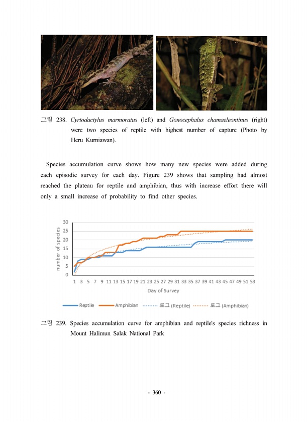 360 238. Cyrtodactylus marmoratus left and Gonocephalus chamaeleontinus right were two species of reptile with highest number of capture Photo by Heru Kurniawan Species accumulation curve shows how many new species were added during each episodic survey for each day. Figure 239 shows that sampling had almost reached the plateau for reptile and amphibian, thus with increase effort there will only a...