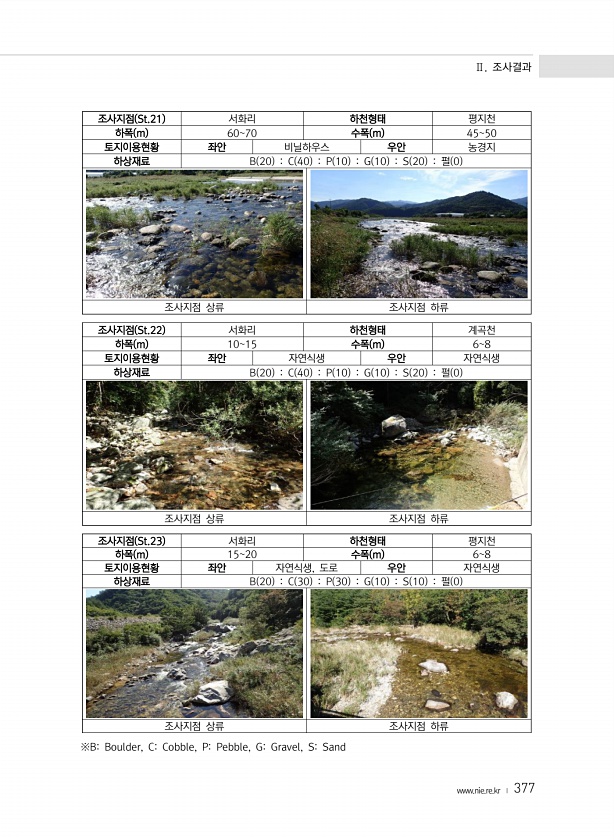 Ⅱ. 조사결과 www.nie.re.kr ? 377 조사지점 St.21 서화리 하천형태 평지천 하폭 m 6070 수폭 m 4550 토지이용현황 좌안 비닐하우스 우안 농경지 하상재료 B 20 C 40 P 10 G 10 S 20 펄 0 조사지점 상류 조사지점 하류 조사지점 St.22 서화리 하천형태 계곡천 하폭 m 1015 수폭 m 68 토지이용현황 좌안 자연식생 우안 자연식생 하상재료 B 20 C 40 P 10 G 10 S 20 펄 0 조사지점 상류 조사지점 하류 조사지점 St.23 서화리 하천형태 평지천 하폭 m 1520 수폭 m 68 토지이용현황 좌안 자연식생, 도로 우안 자연식생 하상재료 B 20 C 30 P 30 G 10 S 10 펄 0 조사지점 상류 조사지점 하류 ※BBoulder, CCobble, P...