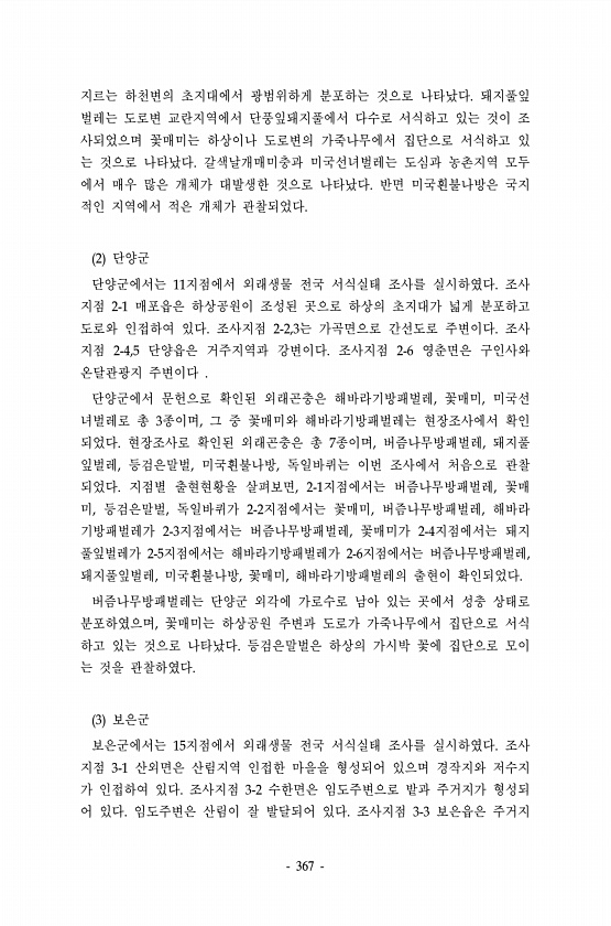 367 지르는 하천변의 초지대에서 광범위하게 분포하는 것으로 나타났다. 돼지풀잎 벌레는 도로변 교란지역에서 단풍잎돼지풀에서 다수로 서식하고 있는 것이 조 사되었으며 꽃매미는 하상이나 도로변의 가죽나무에서 집단으로 서식하고 있 는 것으로 나타났다. 갈색날개매미충과 미국선녀벌레는 도심과 농촌지역 모두 에서 매우 많은 개체가 대발생한 것으로 나타났다. 반면 미국흰불나방은 국지 적인 지역에서 적은 개체가 관찰되었다. 2 단양군 단양군에서는 11지점에서 외래생물 전국 서식실태 조사를 실시하였다. 조사 지점 2-1 매포읍은 하상공원이 조성된 곳으로 하상의 초지대가 넓게 분포하고 도로와 인접하여 있다. 조사지점 2-2,3는 가곡면으로 간선도로 주변이다. 조사 지점 2-4,5 단양읍은 거주지역과 강변이다. 조사지점 2-6...
