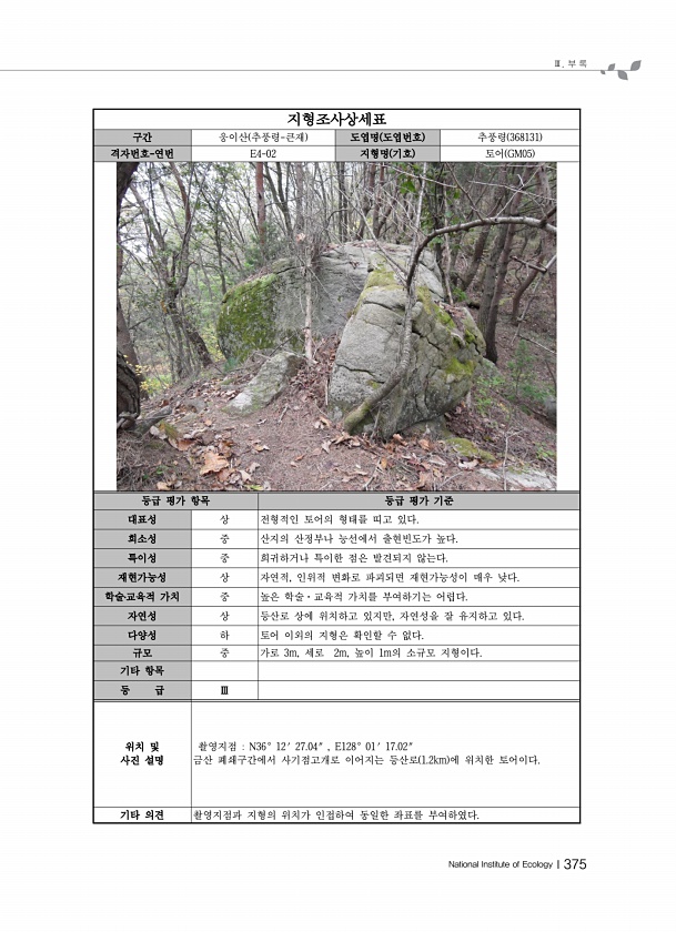 Ⅲ. 부 록 National Institute of EcologyⅠ375 지형조사상세표 구간 웅이산 추풍령-큰재 도엽명 도엽번호 추풍령 368131 격자번호-연번 E4-02 지형명 기호 토어 GM05 등급 평가 항목 등급 평가 기준 대표성 상 전형적인 토어의 형태를 띠고 있다. 희소성 중 산지의 산정부나 능선에서 출현빈도가 높다. 특이성 중 희귀하거나 특이한 점은 발견되지 않는다. 재현가능성 상 자연적, 인위적 변화로 파괴되면 재현가능성이 매우 낮다. 학술?교육적 가치 중 높은 학술·교육적 가치를 부여하기는 어렵다. 자연성 상 등산로 상에 위치하고 있지만, 자연성을 잘 유지하고 있다. 다양성 하 토어 이외의 지형은 확인할 수 없다. 규모 중 가로 3m, 세로 2m, 높이 1m의 소규모 지형이다. 기타 항목 ...