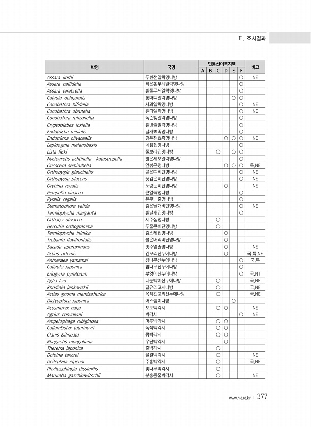 Ⅱ. 조사결과 www.nie.re.kr ? 377 학명 국명 민통선이북지역 비고 A B C D E F Assara korbi 두흰점알락명나방 ○ NE Assara pallidella 작은흰무늬알락명나방 ○ Assara terebrella 흰줄무늬알락명나방 ○ Calguia defiguralis 통마디알락명나방 ○ ○ Conobathra bifidella 사과알락명나방 ○ NE Conobathra obrutella 흰띠알락명나방 ○ NE Conobathra rufizonella 녹슨빛알락명나방 ○ Cryptoblabes loxiella 흰빗줄알락명나방 ○ Endotricha minialis 날개뾰족명나방 ○ Endotricha olivacealis 검은점뾰족명나방 ○ ○ ○ NE Lepidogma melano...