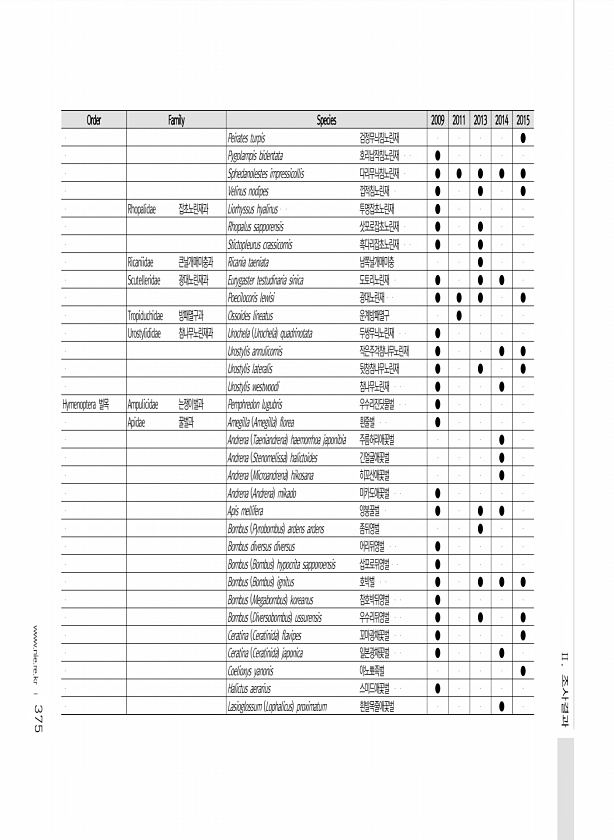 375 Order Family Species 2009 2011 2013 2014 2015 Peirates turpis 검정무늬침노린재 ● Pygolampis bidentata 호리납작침노린재 ● Sphedanolestes impressicollis 다리무늬침노린재 ● ● ● ● ● Velinus nodipes 껍적침노린재 ● ● ● Rhopalidae 잡초노린재과 Liorhyssus hyalinus 투명잡초노린재 ● Rhopalus sapporensis 삿포로잡초노린재 ● ● Stictopleurus crassicornis 흑다리잡초노린재 ● ● Ricaniidae 큰날개매미충과 Ricania taenia...