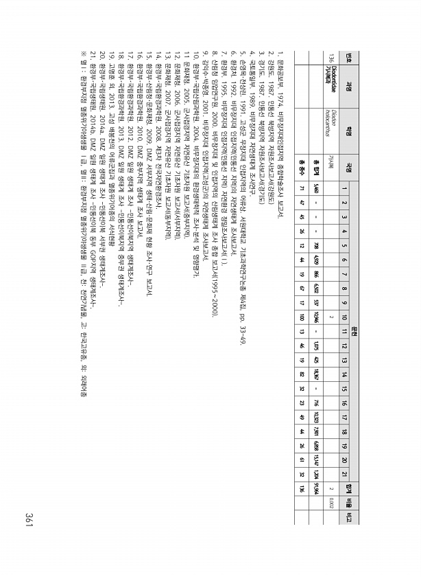 361 번호 과명 학명 국명 문헌 합계 비율 비고 1 2 3 4 5 6 7 8 9 10 11 12 13 14 15 16 17 18 19 20 21 136 Diodontidae 기시복과 Diodon holocanthus 가시복 2 2 0.002 총 합계 5,460 708 4,929 866 6,502 537 10,946 1,075 425 18,367 716 10,323 7,901 6,858 15,147 1,204 91,964 총 종수 71 47 45 26 12 44 19 67 17 100 13 46 19 82 32 23 49 44 26 61 32 136 1. 문화공보부. 1974. 비무장지대인접지역 종합학술조사 보고서. 2. 강원도. 1987. 민통선 북방지역 자원조사보고서 강원도 3. 경기도. 1987. 민통...