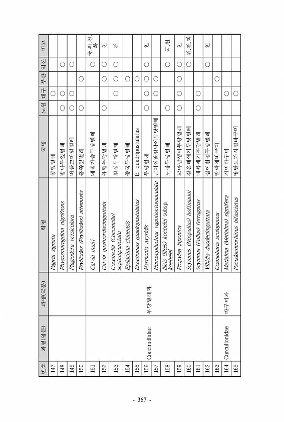 번호 과명 영문 과명 국문 학명 국명 노원 대구 부산 익산 비고 147 Pagria signata 콩잎벌레 ○ 148 Physosmaragdina nigrifrons 밤나무잎벌레 ○ ○ ○ 149 Plagiodera versicolora 버들꼬마잎벌레 ○ ○ ○ 150 Psylliodes Psylliodes attenuata 홀쪽잎벌레 ○ ○ 151 Coccinellidae 무당벌레과 Calvia muiri 네점가슴무당벌레 ○ 국,위,천, 화 152 Calvia quatuordecimguttata 유럽무당벌레 ○ ○ ○ 천 153 Coccinella Coccinella septempunctata 칠성무당벌레 ○ ○ ○ 천 154 Epilachna chinensis 중국무당벌레 ○ 155 Exochomus q...