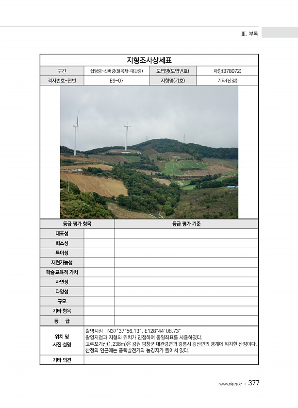 Ⅲ. 부록 www.nie.re.kr ? 377 지형조사상세표 구간 삽당령신배령 닭목재대관령 도엽명 도엽번호 차항 378072 격자번호-연번 E9-07 지형명 기호 기타 산정 등급 평가 항목 등급 평가 기준 대표성 희소성 특이성 재현가능성 학술?교육적 가치 자연성 다양성 규모 기타 항목 등 급 위치 및 사진 설명 촬영지점 N37°37′56.13″, E128°44′08.73″ 촬영지점과 지형의 위치가 인접하여 동일좌표를 사용하였다. 고루포기산 1,238m 은 강원 평창군 대관령면과 강릉시 왕산면의 경계에 위치한 산정이다. 산정의 인근에는 풍력발전기와 농경지가 들어서 있다. 기타의견