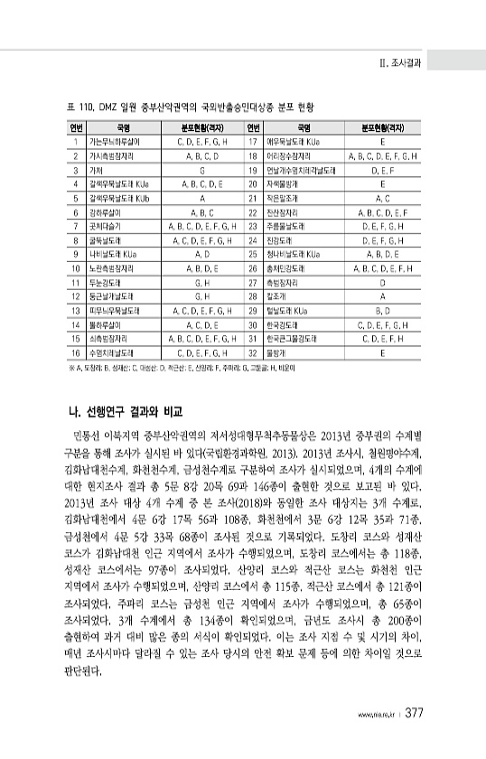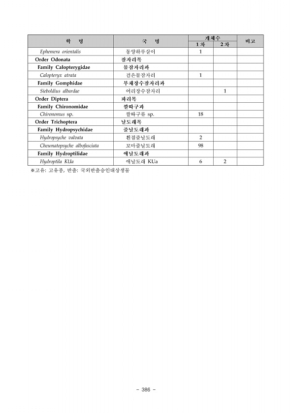 Ⅱ. 조사결과 www.nie.re.kr ? 377 연번 국명 분포현황 격자 연번 국명 분포현황 격자 1 가는무늬하루살이 C, D, E, F, G, H 17 애우묵날도래 KUa E 2 가시측범잠자리 A, B, C, D 18 어리장수잠자리 A, B, C, D, E, F, G, H 3 가채 G 19 연날개수염치레각날도래 D, E, F 4 갈색우묵날도래 KUa A, B, C, D, E 20 자색물방개 E 5 갈색우묵날도래 KUb A 21 작은말조개 A, C 6 강하루살이 A, B, C 22 잔산잠자리 A, B, C, D, E, F 7 곳체다슬기 A, B, C, D, E, F, G, H 23 주름물날도래 D, E, F, G, H 8 굴뚝날도래 A, C, D, E, F, G, H 24 진강도래 D, E, F, G, H...