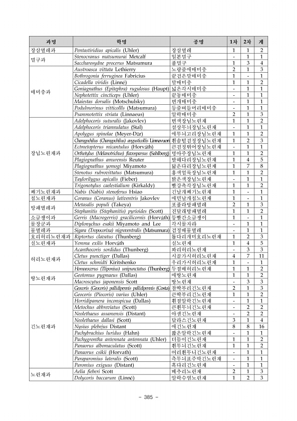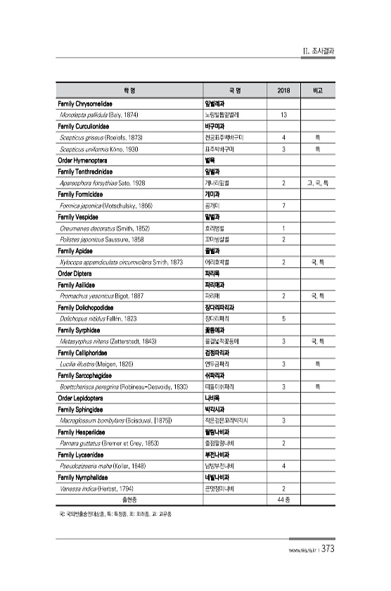 II. 조사결과 www.nie.re.kr ?373 학 명 국 명 2018 비고 Family Chrysomelidae 잎벌레과 Monolepta pallidula Baly, 1874 노랑발톱잎벌레 13 Family Curculionidae 바구미과 Scepticus griseus Roelofs, 1873 천궁표주박바구미 4 특 Scepticus uniformis K?no, 1930 표주박바구미 3 특 Order Hymenoptera 벌목 Family Tenthredinidae 잎벌과 Apareophora forsythiae Sato, 1928 개나리잎벌 2 고, 국, 특 Family Formicidae 개미과 Formica japonica Motschulsky, 1866 곰개미 7 Family Vespidae...