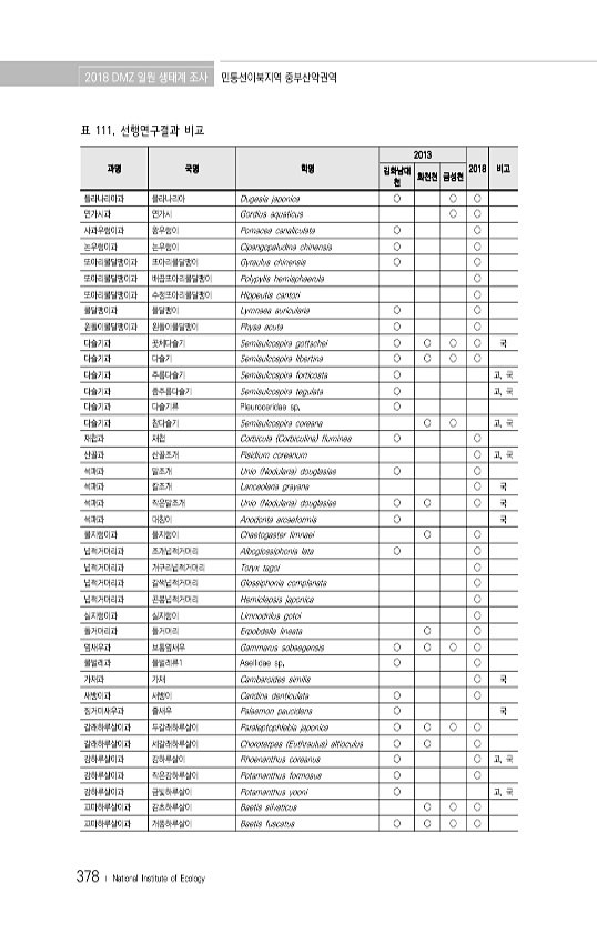 2018 DMZ 일원 생태계 조사 민통선이북지역 중부산악권역 378 ? National Institute of Ecology 과명 국명 학명 2013 김화남대 2018 비고 천 화천천 금성천 플라나리아과 플라나리아 Dugesia japonica ? ? ? 연가시과 연가시 Gordius aquaticus ? ? 사과우렁이과 왕우렁이 Pomacea canaliculata ? ? 논우렁이과 논우렁이 Cipangopaludina chinensis ? ? 또아리물달팽이과 또아리물달팽이 Gyraulus chinensis ? ? 또아리물달팽이과 배꼽또아리물달팽이 Polypylis hemisphaerula ? 또아리물달팽이과 수정또아리물달팽이 Hippeutis cantori ? 물달팽이과 물달팽이 Lymnaea auric...