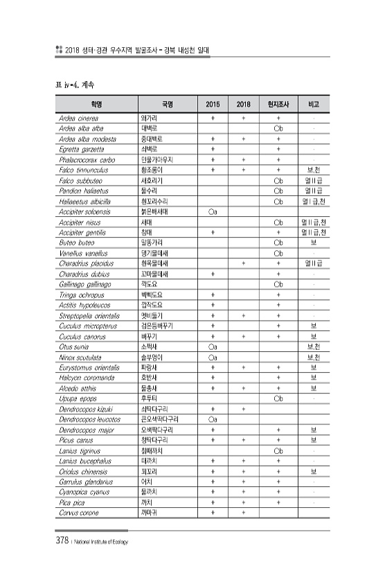 2018 생태·경관 우수지역 발굴조사 경북 내성천 일대 378 ? National Institute of Ecology 학명 국명 2015 2018 현지조사 비고 Ardea cinerea 왜가리 + + + Ardea alba alba 대백로 ○b Ardea alba modesta 중대백로 + + + Egretta garzetta 쇠백로 + + Phalacrocorax carbo 민물가마우지 + + + Falco tinnunculus 황조롱이 + + + 보,천 Falco subbuteo 새호리기 ○b 멸 II 급 Pandion haliaetus 물수리 ○b 멸 II 급 Haliaeetus albicilla 흰꼬리수리 ○b 멸 I 급,천 Accipiter soloensis 붉은배새매 ○a Acci...
