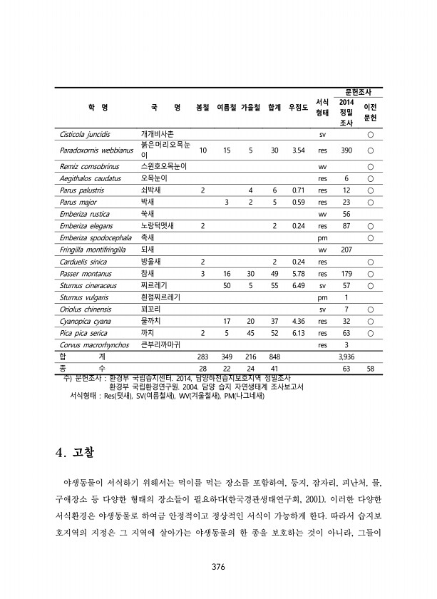 376 주 문헌조사 환경부 국립습지센터. 2014, 담양하천습지보호지역 정밀조사 환경부 국립환경연구원. 2004. 담양 습지 자연생태계 조사보고서 서식형태 Res 텃새 , SV 여름철새 , WV 겨울철새 , PM 나그네새 4. 고찰 야생동물이 서식하기 위해서는 먹이를 먹는 장소를 포함하여, 둥지, 잠자리, 피난처, 물, 구애장소 등 다양한 형태의 장소들이 필요하다 한국경관생태연구회, 2001 이러한 다양한 서식환경은 야생동물로 하여금 안정적이고 정상적인 서식이 가능하게 한다. 따라서 습지보 호지역의 지정은 그 지역에 살아가는 야생동물의 한 종을 보호하는 것이 아니라, 그들이 학 명 국 명 봄철 여름철 가을철 합계 우점도 서식 형태 문헌조사 2014 정밀 조사 이전 문헌 Cisticola juncidis 개개...