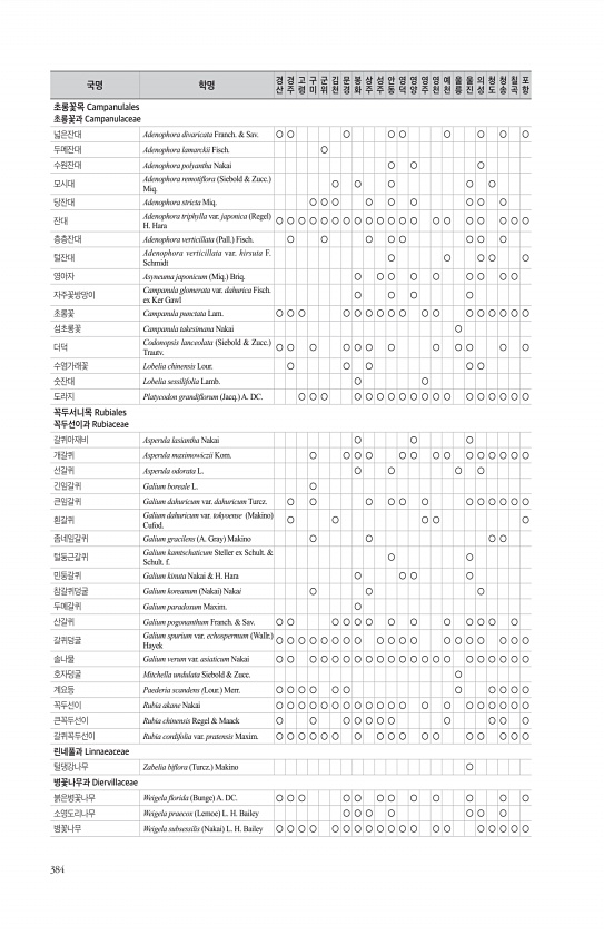 384 초롱꽃목 Campanulales 초롱꽃과 Campanulaceae 넓은잔대 Adenophora divaricata Franch. & Sav. ○ ○ ○ ○ ○ ○ ○ ○ ○ 두메잔대 Adenophora lamarckii Fisch. ○ 수원잔대 Adenophora polyantha Nakai ○ ○ ○ 모시대 Adenophora remotifora Siebold & Zucc. Miq. ○ ○ ○ ○ ○ 당잔대 Adenophora stricta Miq. ○ ○ ○ ○ ○ ○ ○ ○ ○ 잔대 Adenophora triphylla var. japonica Regel H. Hara ○ ○ ○ ○ ○ ○ ○ ○ ○ ○ ○ ○ ○ ○ ○ ○ ○ ○ ○ ○ 층층잔대 Adenophora verticillata Pa...