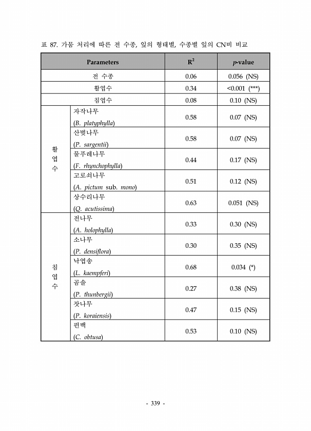 339 Parameters R2 p-value 전 수종 0.06 0.056 NS 활엽수 0.34 0.001 *** 침엽수 0.08 0.10 NS 활 엽 수 자작나무 B. platyphylla 0.58 0.07 NS 산벚나무 P. sargentii 0.58 0.07 NS 물푸레나무 F. rhynchophylla 0.44 0.17 NS 고로쇠나무 A. pictum sub. mono 0.51 0.12 NS 상수리나무 Q. acutissima 0.63 0.051 NS 침 엽 수 전나무 A. holophylla 0.33 0.30 NS 소나무 P. densiflora 0.30 0.35 NS 낙엽송 L. kaempferi 0.68 0.034 * 곰솔 P. thunbergii 0.27 0.38 NS 잣나무 P. korai...