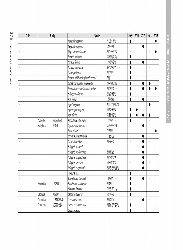 376 Order Family Species 2009 2011 2013 2014 2015 Megachile lapponica 노란줄가위벌 ● ● Megachile nipponica 장미가위벌 ● Megachile remotissimo 어리극동가위벌 ● Nomada calloptera 콕케렐알락꽃벌 ● Nomada fervens 꼬마알락꽃벌 ● ● Nomada harimensis 동양알락꽃벌 ● Osmia pedicornis 뿔가위벌 ● Bombus Psithyrus sylvestris popovi 떡벌 ● Eucera Synthalonia nipponensis 일본애수염줄...