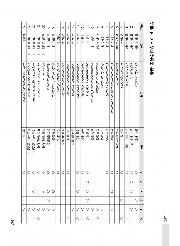 Ⅴ. 부록 362 번호 과명 학명 국명 1 2 3 4 5 6 1 플라나리아과 Dugesia japonica 플라나리아 ○ ○ ○ 2 플라나리아과 Dugesia sp. 플라나리아류 ○ ○ ○ ○ 3 플라나리아과 Phagocata vivida 산골플라나리아 ○ 4 연가시과 Gordius aquaticus 연가시 ○ ○ ○ 5 쨈물우렁이과 Oxyloma hirasei 뾰족쨈물우렁이 ○ 6 논우렁이과 Cipangopaludina chinensis malleata 논우렁이 ○ ○ ○ ○ 7 논우렁이과 Cipangopaludina japonica 큰논우렁이 ○ 8 논우렁이과 Sinotaia quadrata 강우렁이 ○ 9 ...