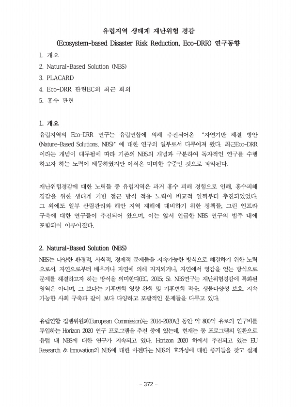 유럽지역 생태계 재난위험 경감 Ecosystem-based Disaster Risk Reduction, Eco-DRR 연구동향 1. 개요 2. Natural-Based Solution NBS 3. PLACARD 4. Eco-DRR 관련EC의 최근 회의 5. 홍수 관련 1. 개요 유럽지역의 Eco-DRR 연구는 유럽연합에 의해 추진되어온 ‘자연기반 해결 방안 Nature-Based Solutions, NBS ’ 에 대한 연구의 일부로서 다루어져 왔다. 최근Eco-DRR 이라는 개념이 대두됨에 따라 기존의 NBS의 개념과 구분하여 독자적인 연구를 수행 하고자 하는 노력이 태동하였지만 아직은 미미한 수준인 것으로 파악된다. 재난위험경감에 대한 노력들 중 유럽지역은 과거 홍수 피해 경험으로 인해, 홍수피해 경감을 ...
