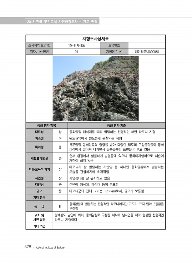 2015 전국 무인도서 자연환경조사 완도 권역 378 ? National Institute of Ecology 지형조사상세표 조사지역 도엽명 15-형제상도 도엽번호 격자번호-연번 01 지형명 기호 해안타포니 GC08 등급 평가 항목 등급 평가 기준 대표성 상 응회암질 해식애를 따라 발달하는 전형적인 해안 타포니 지형 희소성 하 완도권역에서 빈도높게 관찰되는 지형 특이성 중 유문암질 응회암류의 영향을 받아 다양한 입도의 구성물질들이 풍화 과정에서 떨어져 나가면서 울퉁불퉁한 표면을 이루고 있음 재현불가능성 중 현재 환경에서 활발하게 발달중에 있으나 풍화미지형이므로 훼손이 재현이 쉽지 않음 학술?교육적 가치 상 타포니가 잘 발달하는 기반암 중 하나인 응회암류에서 발달하는 모습을 관찰하기에 효과적임 자연성 상 자연...