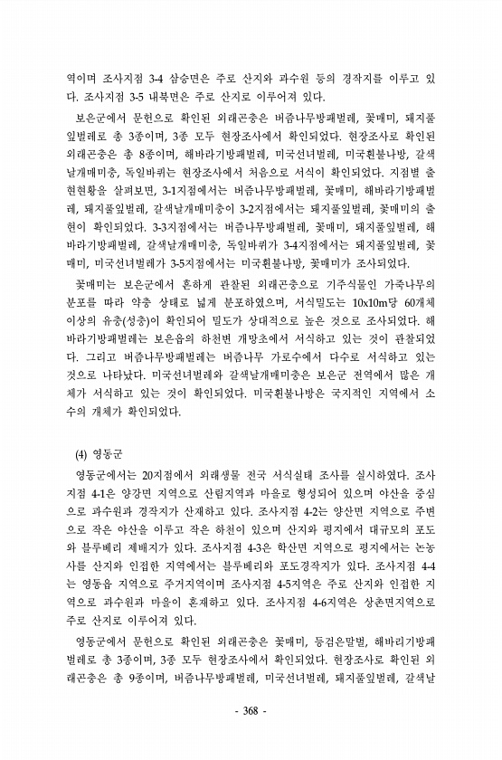 368 역이며 조사지점 3-4 삼승면은 주로 산지와 과수원 등의 경작지를 이루고 있 다. 조사지점 3-5 내북면은 주로 산지로 이루어져 있다. 보은군에서 문헌으로 확인된 외래곤충은 버즘나무방패벌레, 꽃매미, 돼지풀 잎벌레로 총 3종이며, 3종 모두 현장조사에서 확인되었다. 현장조사로 확인된 외래곤충은 총 8종이며, 해바라기방패벌레, 미국선녀벌레, 미국흰불나방, 갈색 날개매미충, 독일바퀴는 현장조사에서 처음으로 서식이 확인되었다. 지점별 출 현현황을 살펴보면, 3-1지점에서는 버즘나무방패벌레, 꽃매미, 해바라기방패벌 레, 돼지풀잎벌레, 갈색날개매미충이 3-2지점에서는 돼지풀잎벌레, 꽃매미의 출 현이 확인되었다. 3-3지점에서는 버즘나무방패벌레, 꽃매미, 돼지풀잎벌레, 해 바라기방패벌레, 갈색날개매미충, 독일바...