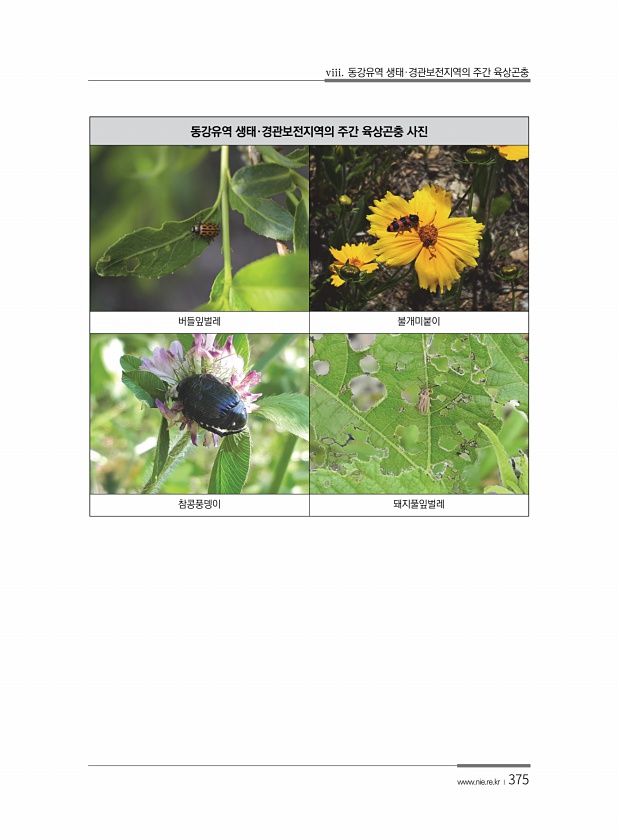viii. 동강유역 생태·경관보전지역의 주간 육상곤충 www.nie.re.kr ?375 동강유역 생태·경관보전지역의 주간 육상곤충 사진 버들잎벌레 불개미붙이 참콩풍뎅이돼지풀잎벌레