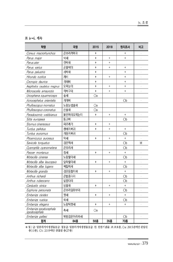 iv. 조 류 www.nie.re.kr ? 379 학명 국명 2015 2018 현지조사 비고 Corvus macrorhynchos 큰부리까마귀 + + Parus major 박새 + + + Parus ater 진박새 + + Parus varius 곤줄박이 + + + Parus palustris 쇠박새 + + Hirundo rustica 제비 + + + Cecropis daurica 귀제비 + + Aegithalos caudatus magnus 오목눈이 + + + Microscelis amaurotis 직박구리 + + + Urosphena squameiceps 숲새 ○a Acrocephalus orientalis 개개비 ○b Phylloscopus inornatus 노랑눈썹솔새 ○a...