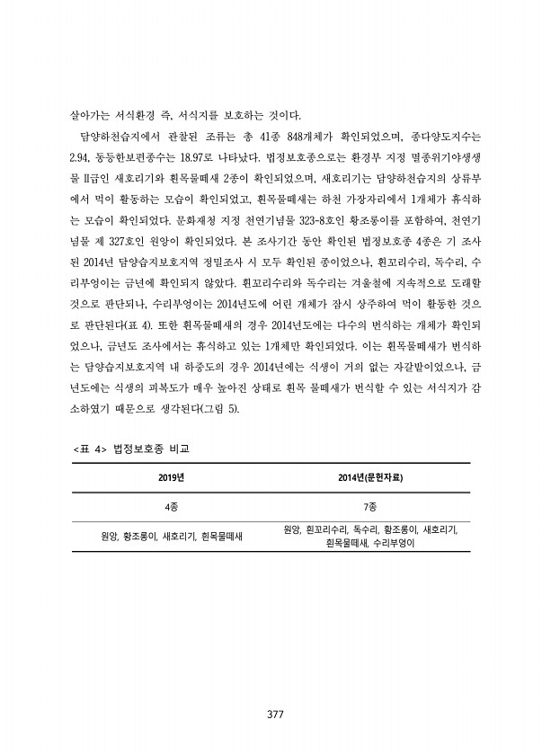 377 살아가는 서식환경 즉, 서식지를 보호하는 것이다. 담양하천습지에서 관찰된 조류는 총 41종 848개체가 확인되었으며, 종다양도지수는 2.94, 동등한보편종수는 18.97로 나타났다. 법정보호종으로는 환경부 지정 멸종위기야생생 물 II급인 새호리기와 흰목물떼새 2종이 확인되었으며, 새호리기는 담양하천습지의 상류부 에서 먹이 활동하는 모습이 확인되었고, 흰목물떼새는 하천 가장자리에서 1개체가 휴식하 는 모습이 확인되었다. 문화재청 지정 천연기념물 323-8호인 황조롱이를 포함하여, 천연기 념물 제 327호인 원앙이 확인되었다. 본 조사기간 동안 확인된 법정보호종 4종은 기 조사 된 2014년 담양습지보호지역 정밀조사 시 모두 확인된 종이었으나, 흰꼬리수리, 독수리, 수 리부엉이는 금년에 확인되지 않았다....