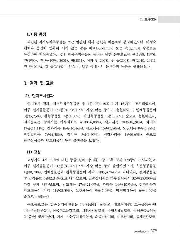 Ⅱ. 조사결과 www.nie.re.kr ? 379 3 종 동정 채집된 저서무척추동물은 최근 발간된 책과 문헌을 이용하여 동정하였으며, 미성숙 개체와 동정이 명확히 되지 않는 종은 아과 subfamily 또는 속 genus 수준으로 동정하여 제시하였다. 국내 저서무척추동물 동정을 위한 문헌으로는 윤 1988, 1995 , 권 1990 , 권 등 1993, 2001 , 정 2011 , 이와 민 2005 , 원 등 2005 , 배 2010, 2011 , 권 등 2013 , 김 등 2013 이 있으며, 일부 국내·외 분류학적 논문을 인용하였다. 3. 결과 및 고찰 가. 현지조사결과 현지조사 결과, 저서무척추동물은 총 4문 7강 18목 71과 153종이 조사되었으며, 이중 절지동물문이 137종 89.54% 으로 가장...