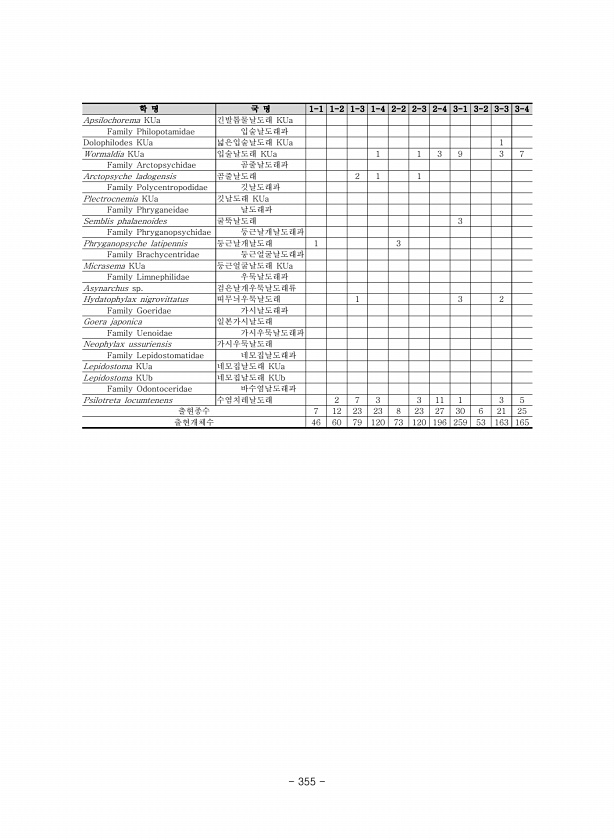 학 명 국 명 1-1 1-2 1-3 1-4 2-2 2-3 2-4 3-1 3-2 3-3 3-4 Apsilochorema KUa 긴발톱물날도래 KUa Family Philopotamidae 입술날도래과 Dolophilodes KUa 넓은입술날도래 KUa 1 Wormaldia KUa 입술날도래 KUa 1 1 3 9 3 7 Family Arctopsychidae 곰줄날도래과 Arctopsyche ladogensis 곰줄날도래 2 1 1 Family Polycentropodidae 깃날도래과 Plectrocnemia KUa 깃날도래 KUa ...