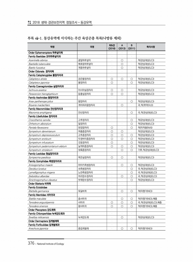 2018 생태·경관보전지역 정밀조사 동강유역 376 ? National Institute of Ecology 학명 국명 최&강 2018 A 2013 B 2011 특이사항 Order Ephemeroptera 하루살이목 Family Baetidae 꼬마하루살이과 Acentrella sibirica 콩알하루살이 ○ 적 관심대상 LC Baetiella tuberculata 애호랑하루살이 ○ 적 관심대상 LC Baetis fuscatus 개똥하루살이 ○ 적 관심대상 LC Order Odonata 잠자리목 Family Calopterygidae 물잠자리과 Calopteryx atrata 검은물잠자리 ○ ○ ○ 적 관심대상 LC Calopteryx japonica 물잠자리 ○ ○ 적 관심대상 L...