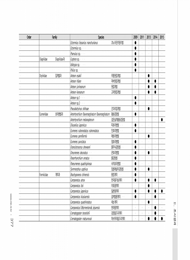 377 Order Family Species 2009 2011 2013 2014 2015 Ectemnius fossorius manchurianus 코노우은주둥이벌 ● Ectemnius sp. ● Psenulus sp. ● Diapriidae Diapriidae과 Coptera sp. ● Idiotypa sp. ● Psilus sp. ● Dryinidae 집게벌과 Anteon esakii 주름원집게벌 ● Anteon hilare 자바원집게벌 ● ● Anteon jurineanum 원집게벌 ● ● Anteon koreanum 고려원집게벌 ● ...