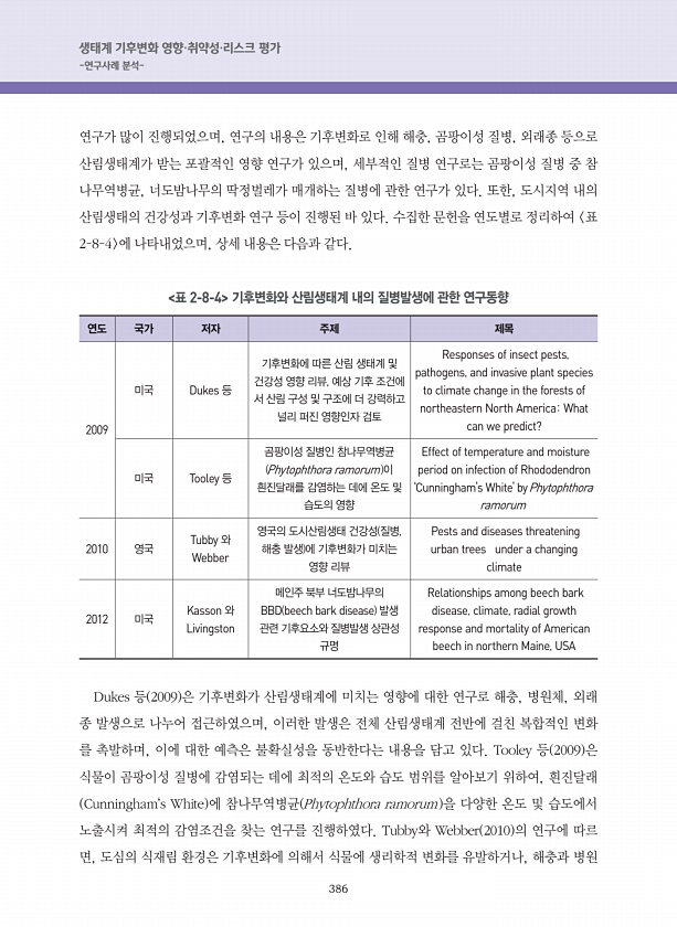 386 생태계 기후변화 영향·취약성·리스크 평가 -연구사례 분석- 연구가 많이 진행되었으며, 연구의 내용은 기후변화로 인해 해충, 곰팡이성 질병, 외래종 등으로 산림생태계가 받는 포괄적인 영향 연구가 있으며, 세부적인 질병 연구로는 곰팡이성 질병 중 참 나무역병균, 너도밤나무의 딱정벌레가 매개하는 질병에 관한 연구가 있다. 또한, 도시지역 내의 산림생태의 건강성과 기후변화 연구 등이 진행된 바 있다. 수집한 문헌을 연도별로 정리하여 표 2-8-4 에 나타내었으며, 상세 내용은 다음과 같다. 표 2-8-4 기후변화와 산림생태계 내의 질병발생에 관한 연구동향 연도 국가 저자 주제 제목 2009 미국 Dukes 등 기후변화에 따른 산림 생태계 및 건강성 영향 리뷰, 예상 기후 조건에 서 산림 구성 및 구조에 더 ...