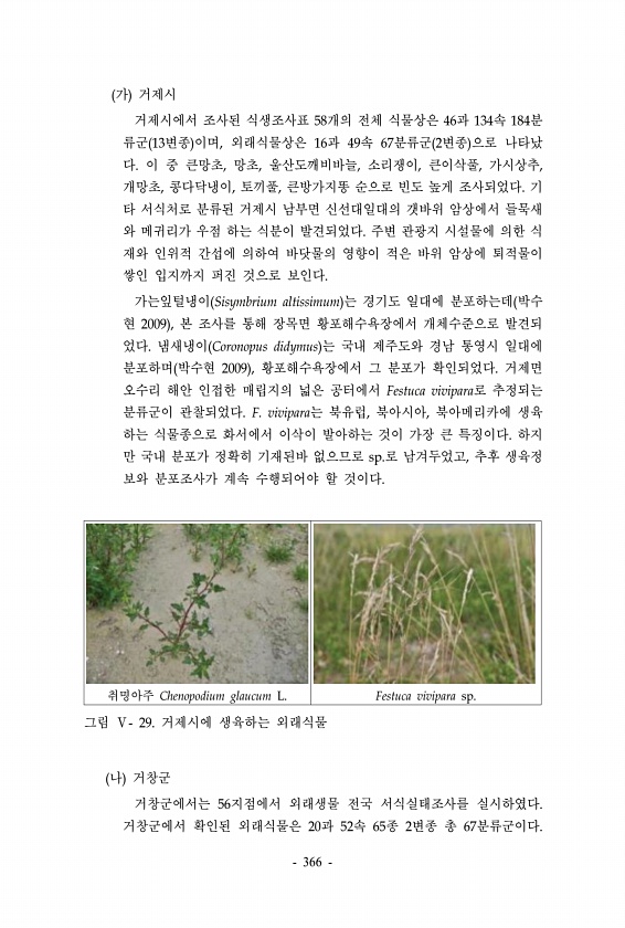 가 거제시 거제시에서 조사된 식생조사표 58개의 전체 식물상은 46과 134속 184분 류군 13변종 이며, 외래식물상은 16과 49속 67분류군 2변종 으로 나타났 다. 이 중 큰망초, 망초, 울산도깨비바늘, 소리쟁이, 큰이삭풀, 가시상추, 개망초, 콩다닥냉이, 토끼풀, 큰방가지똥 순으로 빈도 높게 조사되었다. 기 타 서식처로 분류된 거제시 남부면 신선대일대의 갯바위 암상에서 들묵새 와 메귀리가 우점 하는 식분이 발견되었다. 주변 관광지 시설물에 의한 식 재와 인위적 간섭에 의하여 바닷물의 영향이 적은 바위 암상에 퇴적물이 쌓인 입지까지 퍼진 것으로 보인다. 가는잎털냉이 Sisymbrium altissimum 는 경기도 일대에 분포하는데 박수 현 2009 , 본 조사를 통해 장목면 황포해수욕장에서 개체수준...