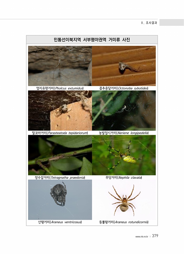 Ⅱ. 조사결과 www.nie.re.kr ? 379 민통선이북지역 서부평야권역 거미류 사진 엄지유령거미 Pholcus extumidus 꼽추응달거미 Octonoba sybotides 말꼬마거미 Parasteatoda tepidariorum 농발접시거미 Neriene longipedella 장수갈거미 Tetragnatha praedonia 무당거미 Nephila clavata 산왕거미 Araneus ventricosus 등뿔왕거미 Araneus rotundicornis