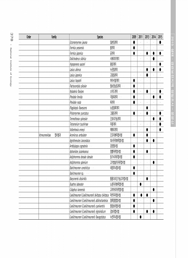 378 Order Family Species 2009 2011 2013 2014 2015 Ectomomyrmex javana 일본침개미 ● ● Formica yessensis 불개미 ● Formica japonica 곰개미 ● ● ● ● Dolichoderus sibirica 시베리아개미 ● Hypoponera sauteri 황침개미 ● Lasius alienus 누운털개미 ● ● ● Lasius japonica 고동털개미 ● Lasius hayashi 하야시털개미 ● Pachycondyla pilosior 털보장님침개미 ● Nyladeria flavipes 스미드개미 ● ...