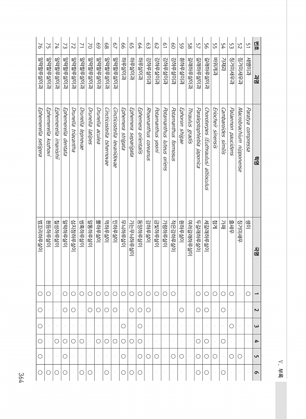 Ⅴ. 부록 364 번호 과명 학명 국명 1 2 3 4 5 6 51 새뱅이과 Paratya compressa 생이 ○ 52 징거미새우과 Macrobrachium nipponense 징거미새우 ○ 53 징거미새우과 Palaemon paucidens 줄새우 ○ ○ ○ 54 가재과 Cambaroides similis 가재 ○ ○ ○ ○ 55 바위게과 Eriocheir sinensis 참게 ○ ○ 56 갈래하루살이과 Choroterpes Euthraulus altioculus 세갈래하루살이 ○ ○ ○ ○ ○ 57 갈래하루살이과 Paraleptophlebia japonica 두갈래하루살이 ○ ○ ○ ○ ○ 58 갈래하루살이과 Thraulus g...