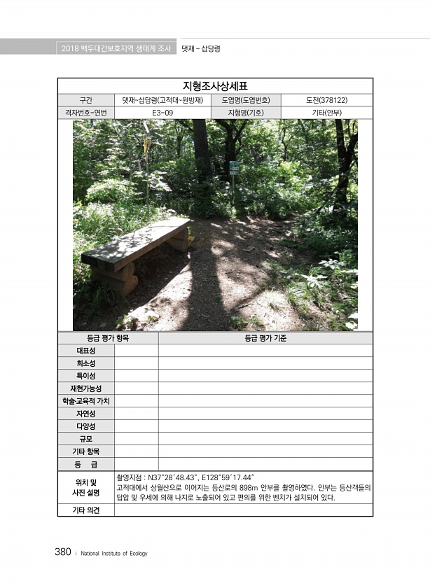 2018 백두대간보호지역 생태계 조사 댓재 삽당령 380 ? National Institute of Ecology 지형조사상세표 구간 댓재삽당령 고적대원방재 도엽명 도엽번호 도전 378122 격자번호-연번 E3-09 지형명 기호 기타 안부 등급 평가 항목 등급 평가 기준 대표성 희소성 특이성 재현가능성 학술?교육적 가치 자연성 다양성 규모 기타 항목 등 급 위치 및 사진 설명 촬영지점 N37°28′48.43″, E128°59′17.44″ 고적대에서 상월산으로 이어지는 등산로의 898m 안부를 촬영하였다. 안부는 등산객들의 답압 및 우세에 의해 나지로 노출되어 있고 편의를 위한 벤치가 설치되어 있다. 기타의견