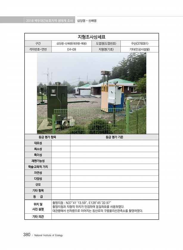 2018 백두대간보호지역 생태계 조사 삽당령 신배령 380 ? National Institute of Ecology 지형조사상세표 구간 삽당령신배령 대관령매봉 도엽명 도엽번호 구산 378081 격자번호-연번 E4-09 지형명 기호 기타 인공시설물 등급 평가 항목 등급 평가 기준 대표성 희소성 특이성 재현가능성 학술?교육적 가치 자연성 다양성 규모 기타 항목 등 급 위치 및 사진 설명 촬영지점 N37°41′13.59″, E128°45′32.97″ 촬영지점과 지형의 위치가 인접하여 동일좌표를 사용하였다. 대관령에서 선자령으로 이어지는 등산로의 구름물리선관측소를 촬영하였다. 기타의견