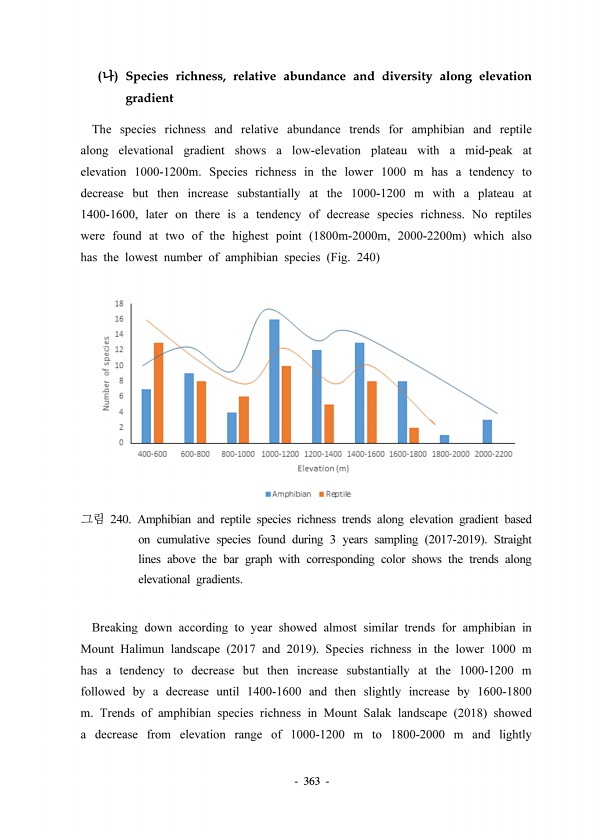 363 Species richness, relative abundance and diversity along elevation gradient The species richness and relative abundance trends for amphibian and reptile along elevational gradient shows a low-elevation plateau with a mid-peak at elevation 1000-1200m. Species richness in the lower 1000 m has a tendency to decrease but then increase substantially at the 1000-1200 m with a plateau at 1400-1600, l...