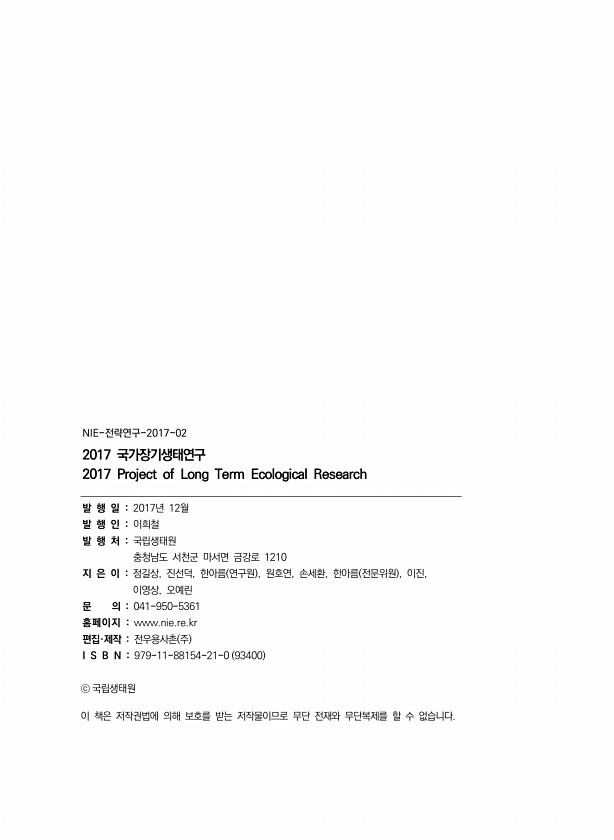 NIE-전략연구-2017-02 2017 국가장기생태연구 2017 Project of Long Term Ecological Research 발 행 일 2017년 12월 발 행 인 이희철 발 행 처 국립생태원 충청남도 서천군 마서면 금강로 1210 지 은 이 정길상, 진선덕, 한아름 연구원 , 원호연, 손세환, 한아름 전문위원 , 이진, 이영상, 오예린 문 의 041-950-5361 홈페이지 www.nie.re.kr 편집·제작 전우용사촌 주 I S B N 979-11-88154-21-0 93400 ⓒ 국립생태원 이 책은 저작권법에 의해 보호를 받는 저작물이므로 무단 전재와 무단복제를 할 수없습니다.