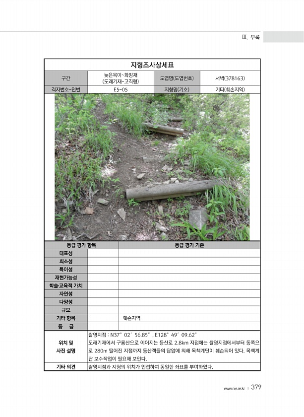 Ⅲ. 부록 www.nie.re.kr ? 379 지형조사상세표 구간 늦은목이화방재 도래기재-고직령 도엽명 도엽번호 서벽 378163 격자번호-연번 E5-05 지형명 기호 기타 훼손지역 등급 평가 항목 등급 평가 기준 대표성 희소성 특이성 재현가능성 학술?교육적 가치 자연성 다양성 규모 기타 항목 훼손지역 등 급 위치 및 사진 설명 촬영지점 N37°02′56.85″, E128°49′09.62″ 도래기재에서 구룡산으로 이어지는 등산로 2.8km 지점에는 촬영지점에서부터 동쪽으 로 280m 떨어진 지점까지 등산객들의 답압에 의해 목책계단이 훼손되어 있다. 목책계 단 보수작업이 필요해 보인다. 기타 의견 촬영지점과 지형의 위치가 인접하여 동일한 좌표를부여하였다.