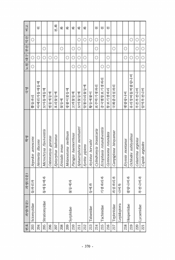 번호 과명 영문 과명 국문 학명 국명 노원 대구 부산 익산 비고 203 Sciomyzidae 들파리과 Sepedon aenescens 뿔들파리 ○ ○ ○ 204 Stratiomyidae 동애등에과 Hermetia illucens 아메리카동애등에 ○ 위 205 Microchrysa flaviventris 꼬마동애등에 ○ ○ 206 Odontomyia garatas 범동애등에 ○ 207 Syrphidae 꽃등에과 Episyrphus balteatus 호리꽃등에 ○ 천,화 208 Eristalis tenax 꽃등에 ○ 화 209 Melanostoma mellinum 광붙이꽃등에 ○ 화 210 Paragus haemorrhous 고려꽃등에 ○ ○ ○ 화 211 Sphaerophoria menthastri 꼬마꽃등에...