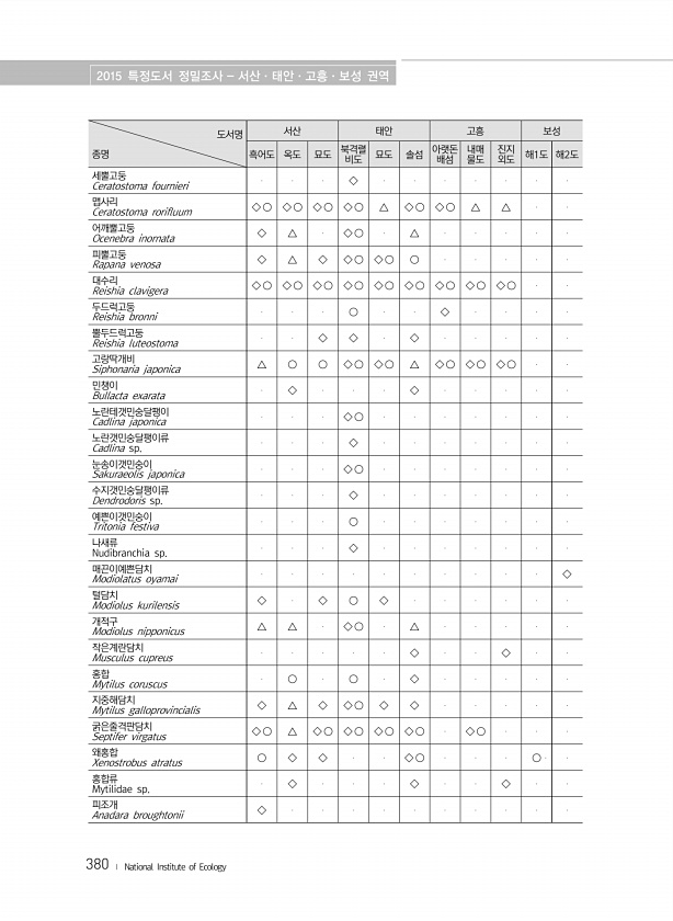 2015 특정도서 정밀조사 서산·태안·고흥·보성 권역 380 ? National Institute of Ecology 도서명 종명 서산 태안 고흥 보성 흑어도 옥도 묘도 북격렬 비도 묘도 솔섬 아랫돈 배섬 내매 물도 진지 외도 해1도 해2도 세뿔고둥 Ceratostoma fournieri ◇ 맵사리 Ceratostoma rorifluum ◇ ○ ◇ ○ ◇ ○ ◇ ○ △ ◇ ○ ◇ ○ △ △ 어깨뿔고둥 Ocenebra inornata ◇ △ ◇ ○ △ 피뿔고둥 Rapana venosa ◇ △ ◇ ◇ ○ ◇ ○ ○ 대수리 Reishia clavigera ◇ ○ ◇ ○ ◇ ○ ◇ ○ ◇ ○ ◇ ○ ◇ ○ ◇ ○ ◇ ○ 두...