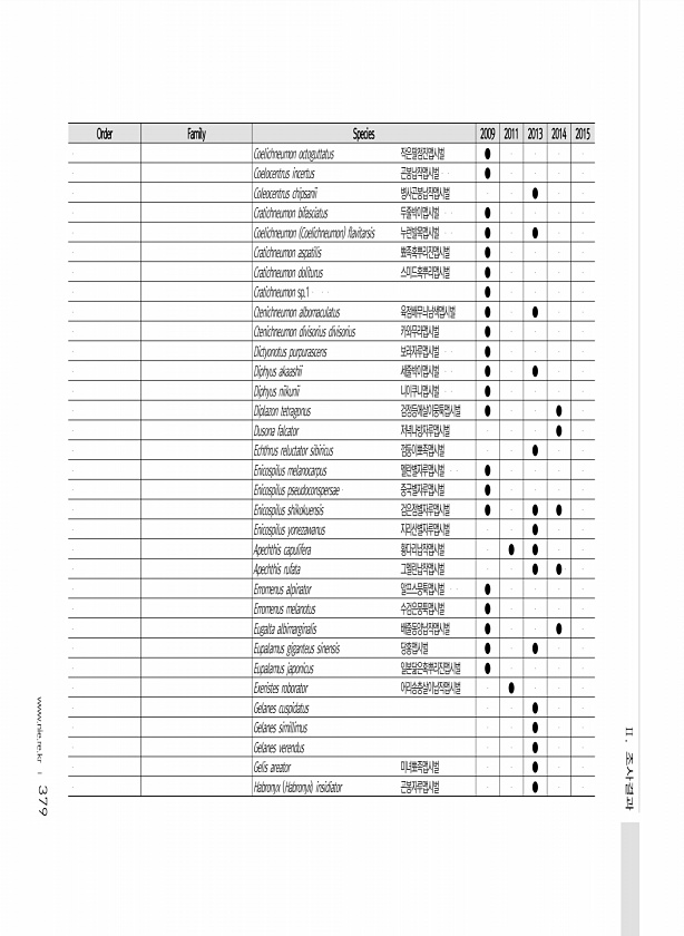 379 Order Family Species 2009 2011 2013 2014 2015 Coelichneumon octoguttatus 작은팔점진맵시벌 ● Coelocentrus incertus 곤봉납작맵시벌 ● Coleocentrus chipsanii 병사곤봉납작맵시벌 ● Cratichneumon bifasciatus 두줄박이맵시벌 ● Coelichneumon Coelichneumon flavitarsis 누런발목맵시벌 ● ● Cratichneumon aspatilis 뾰족혹뿌리진맵시벌 ● Cratichneumon doliturus 스미드혹뿌리맵시벌 ● Cratichneumon sp.1 ...