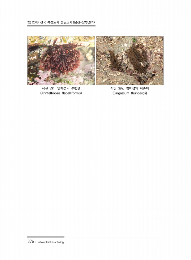2016 전국 특정도서 정밀조사 옹진-남부권역 376 ? National Institute of Ecology 사진 391. 멍애섬의 부챗살 Ahnfeltiopsis flabelliformis 사진 392. 멍애섬의 지충이 Sargassum thunbergii