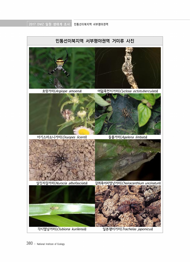 2017 DMZ 일원 생태계 조사 민통선이북지역 서부평야권역 380 ? National Institute of Ecology 민통선이북지역 서부평야권역 거미류 사진 호랑거미 Argiope amoena 여덟혹먼지거미 Cyclosa octotuberculata 아기스라소니거미 Oxyopes licenti 들풀거미 Agelena limbata 살깃자갈거미 Nurscia albofasciata 갈퀴혹어리염낭거미 Cheiracanthium uncinatum 각시염낭거미 Clubiona kurilensis 일본괭이거미 Trachelas japonicus