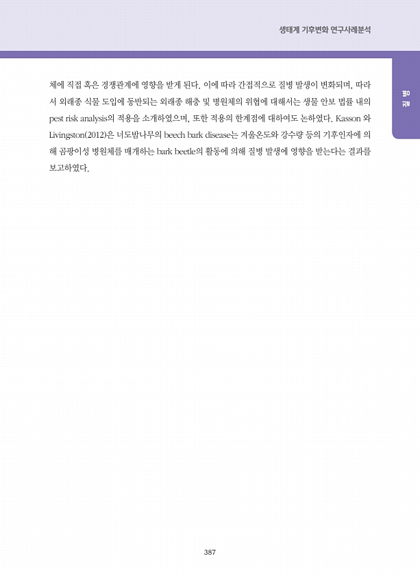 387 생태계 기후변화 연구사례분석 질 병 체에 직접 혹은 경쟁관계에 영향을 받게 된다. 이에 따라 간접적으로 질병 발생이 변화되며, 따라 서 외래종 식물 도입에 동반되는 외래종 해충 및 병원체의 위협에 대해서는 생물 안보 법률 내의 pest risk analysis의 적용을 소개하였으며, 또한 적용의 한계점에 대하여도 논하였다. Kasson 와 Livingston 2012 은 너도밤나무의 beech bark disease는 겨울온도와 강수량 등의 기후인자에 의 해 곰팡이성 병원체를 매개하는 bark beetle의 활동에 의해 질병 발생에 영향을 받는다는 결과를보고하였다.